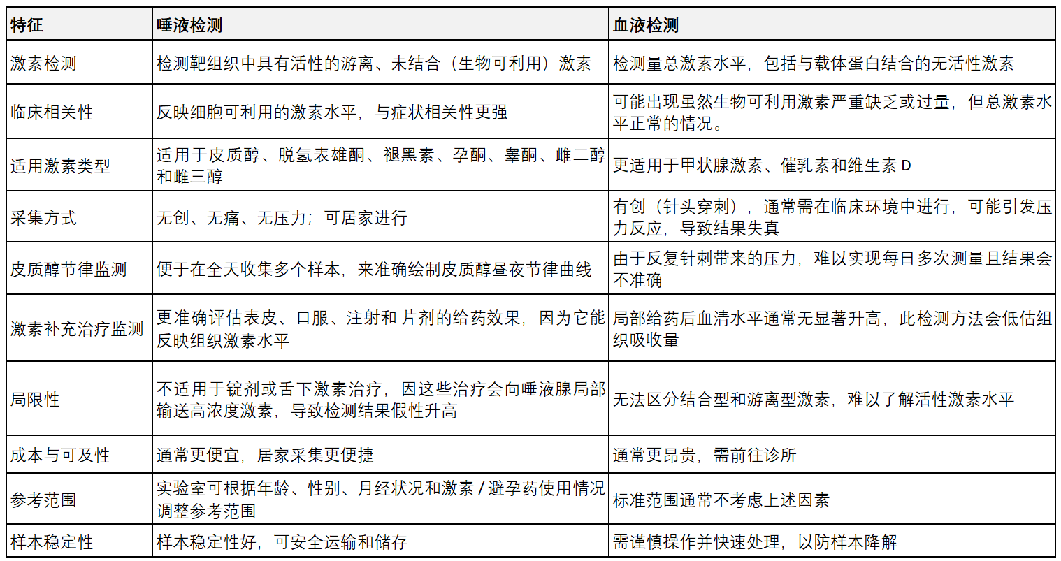 对比激素的唾液检测与激素的血液检测,需关注以下关键点:
