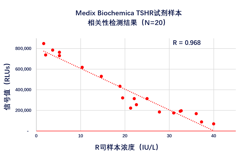近期,Medix Biochemica上市了TSHR抗原,是开发TSHR抗体检测试剂的核心原料,在未经优化的条件下,使用Medix Biochemica TSHR抗原和抗体的化学发光法试剂检测样本,与R司试剂有着良好的相关性,相关系数R>0.96。